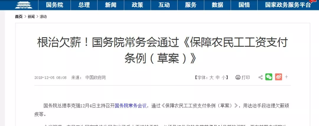 12月4日,國務院常務會議通過《保障農民工工資支付條例(草案)》,強調各級政府和國有企事業(yè)單位不得以任何理由拖欠農民工工資。要在前期專項整治基礎上,用法治手段推動根治拖欠農民工工資問題。